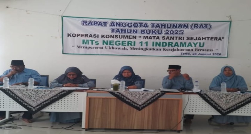 Terisi (KEMENAG), Koperasi Konsumen Mata Santri Sejahtera MTs Negeri 11 Indramayu sukses menyelenggarakan Rapat Anggota Tahunan (RAT) Tahun Buku 2025 pada Rabu (28/01/2026). Kegiatan ini berlangsung khidmat dan penuh semangat kebersamaan, bertempat di Asrama Madrasah MTsN 11 Indramayu.